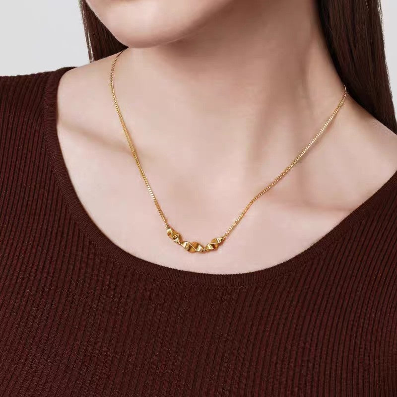 This necklace features a three-dimensional textured bead design with simple yet layered lines. The gold finish is understated and refined, naturally enhancing your overall look for everyday wear.